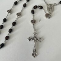 Dimension de la croix : 2cm environ – Longueur du chapelet de Dévotion 33 grains (33 ans des années vécu de jésus sur terre) : 23cm, perles 7mm – 6 petits cœurs 9mm en émail recto verso représentant Marie en couleur.