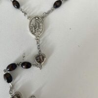Chapelet perles de bois brun foncé, petits cœurs vitrail couleur avec médaille de Ste Bernadette et croix de Jésus joliment ciselée. Chaîne en acier Inoxydable.